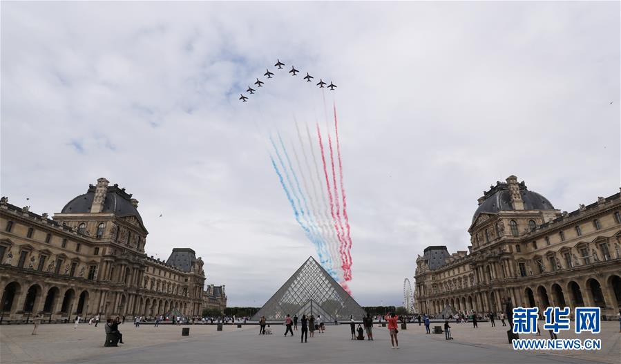 7月14日,“法兰西巡逻兵”飞行表演队飞过法国巴黎卢浮宫玻璃金字塔广场。法国一年一度的国庆阅兵式14日在巴黎举行。受疫情影响,法国总统马克龙没有在香榭丽舍大街举行国庆阅兵式,而是在协和广场举行小型庆祝仪式,向在抗疫斗争中做出贡献的公民致敬。新华社记者高静摄