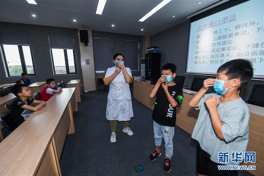7月16日,小学生在东林镇卫生院医护人员的示范和讲解下学习正确佩戴口罩。当日,浙江省湖州市吴兴区东林镇举办暑期“安全防护小超人”主题活动。活动由医护人员、消防队员等为学生及家长讲授日常安全避险及溺水急救知识,中小学们还在现场学习了简易包扎、心肺复苏的正确方式,并了解灭火器、灭火毯等消防器材的使用,为学生平安过暑期打好安全防护“预防针”。新华社记者 徐昱 摄