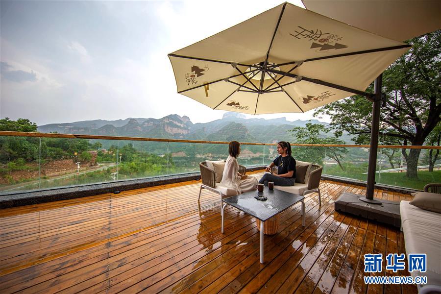 7月15日,游客在武安市活水乡王坡民宿聊天。近年来,河北省武安市活水乡依托当地自然生态优势,大力发展乡村旅游,利用空闲民居打造特色乡村精品民宿,为农村发展注入新活力,助力乡村振兴。新华社记者 王晓 摄