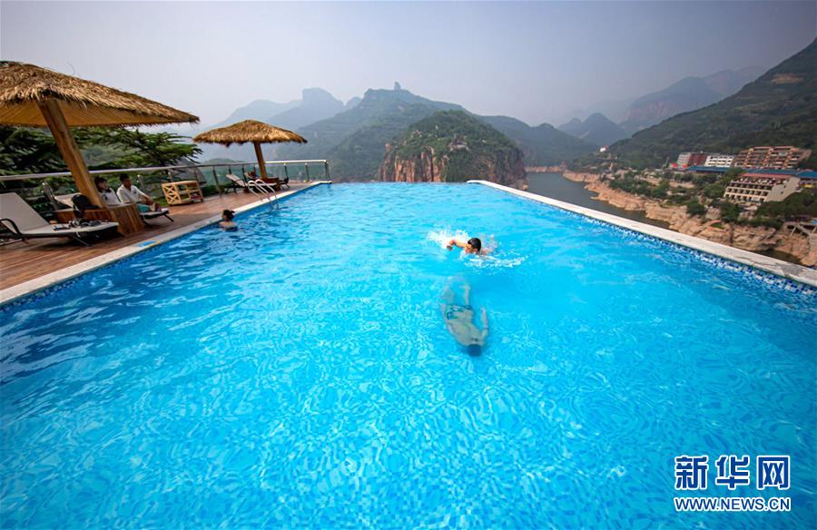 7月15日,游客在武安市活水乡松林山庄民宿内游泳。新华社记者 王晓 摄