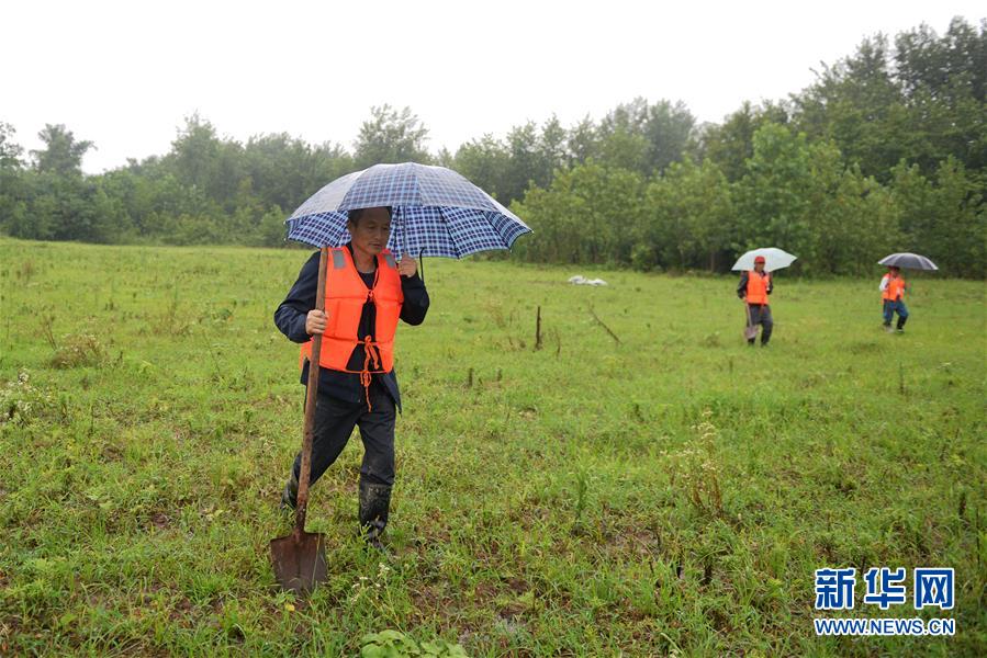 7月16日,铁铜乡新丰村的抗洪抢险队员鲍大友(左)和队友在圩堤上巡堤查险。受长江持续高水位影响,安徽省枞阳县的铁铜乡江心洲已于近日将江心洲上的居民转移安置,而包括抢险队员、乡镇干部、水利工程师等在内的近300人“留守”在江心洲上巡堤查险,守护家园。铁铜乡位于长江江心洲上,有4个行政村52个村民组,耕地面积12000多亩。新华社记者黄博涵摄
