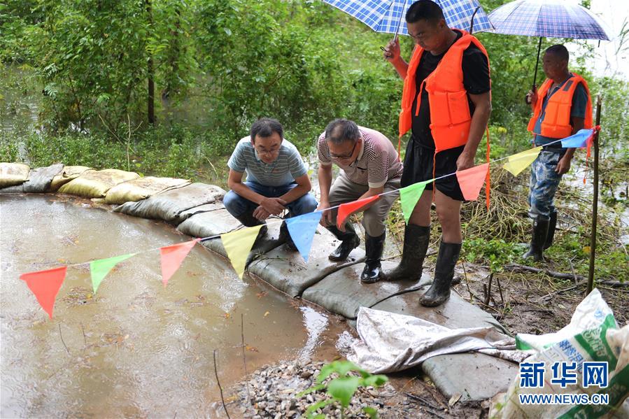 7月16日,枞阳县水利局高级工程师舒晓安(左二)查看之前处置的险情发生点。受长江持续高水位影响,安徽省枞阳县的铁铜乡江心洲已于近日将江心洲上的居民转移安置,而包括抢险队员、乡镇干部、水利工程师等在内的近300人“留守”在江心洲上巡堤查险,守护家园。铁铜乡位于长江江心洲上,有4个行政村52个村民组,耕地面积12000多亩。新华社记者黄博涵摄