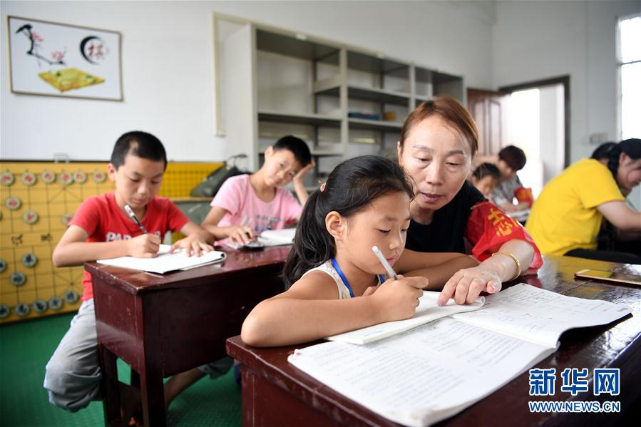 7月16日,在安徽省宿松县洲头乡中心小学集中安置点,教师志愿者辅导孩子们完成暑假作业。