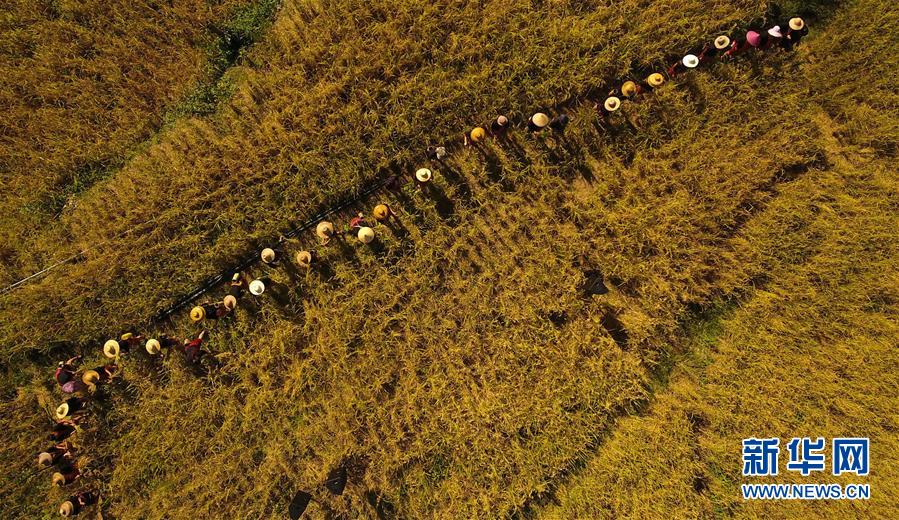 村民在海南省白沙黎族自治县青松乡拥处村的山兰稻田内收割山兰稻(2019年11月17日,无人机照片)。新华社记者杨冠宇摄