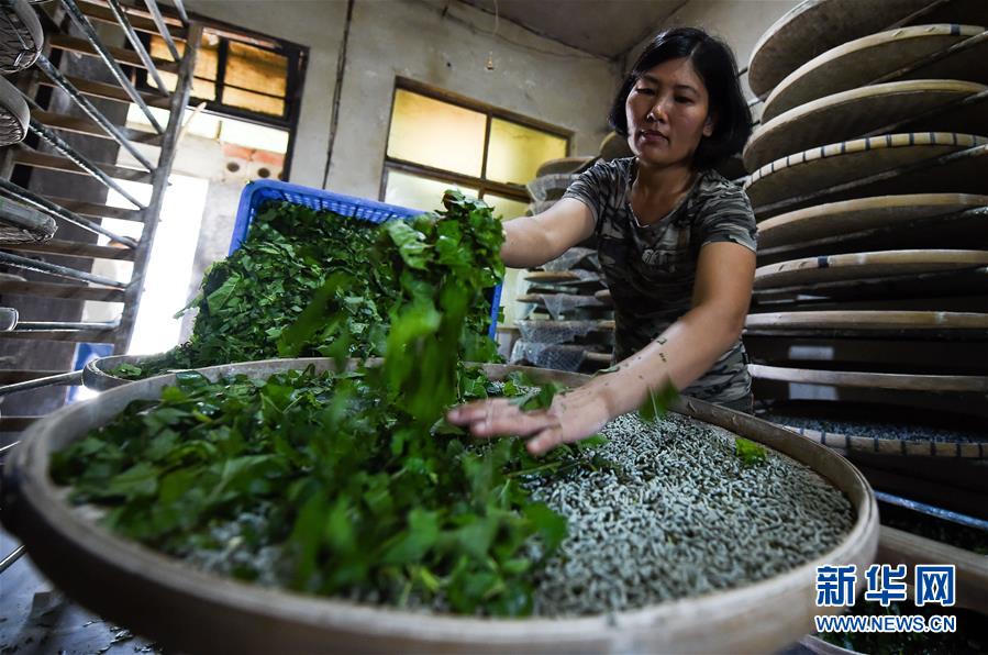 海南省琼中黎族苗族自治县湾岭镇湾岭蚕茧站工作人员在喂养细蚕(2018年8月23日摄)。新华社记者杨冠宇摄
