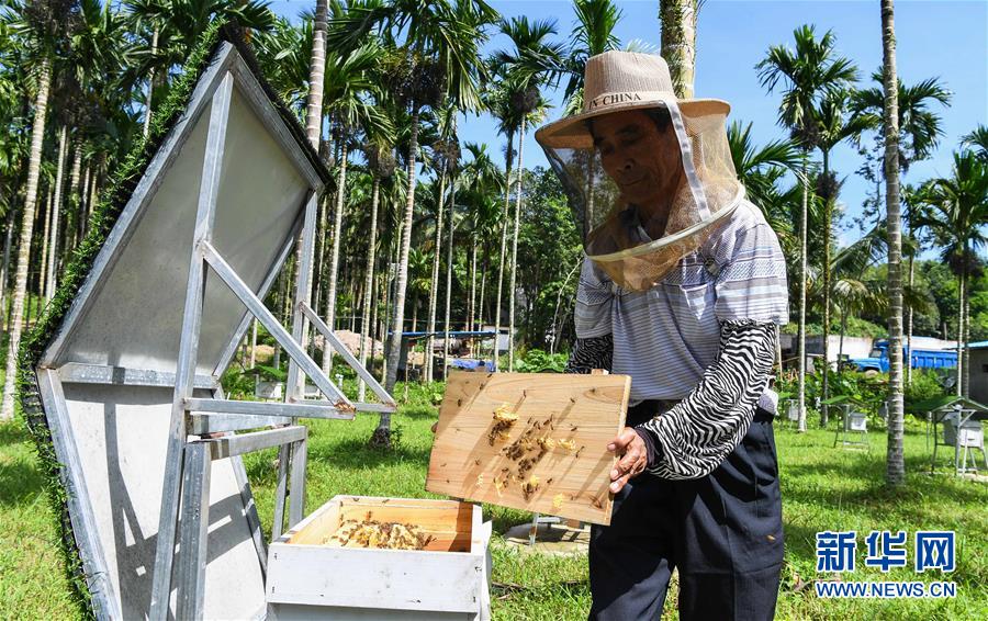 海南省琼中黎族苗族自治县长征镇一家智慧蜂场的工作人员在查看蜂箱(2018年8月22日摄)。新华社记者杨冠宇摄