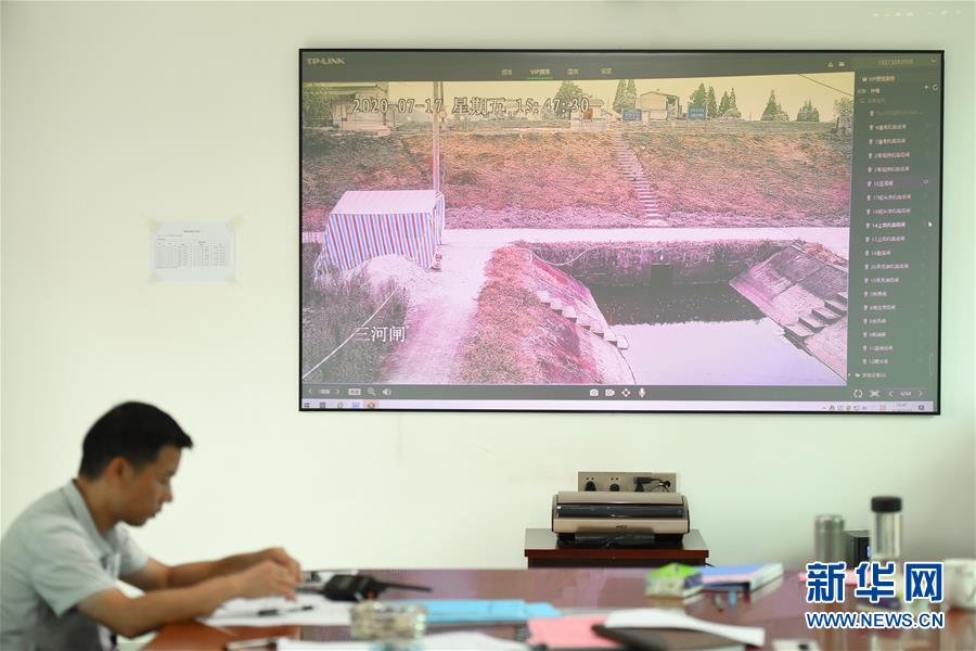 7月17日,在岳阳市华容县治河渡镇防汛抗旱指挥所,大屏实时显示新华垸三门闸附近情况。为力争安全度汛,湖南省岳阳市华容县织密人防、物防、技防“三防”网络,加强应急值守和巡查排险工作,采取“以船代仓”“以车代仓”等多种方式灵活储备防汛物资,在险工险段布置摄像头实时监控,利用无人机对人员难以到达的位置进行巡查。新华社记者陈泽国摄