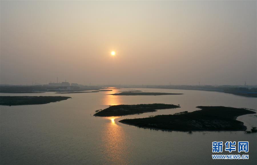 7月17日拍摄的镇赉环城国家湿地公园日出景色(无人机照片)。镇赉环城国家湿地公园位于吉林西部,处于松嫩平原草甸草原向内蒙古高原典型草原的过渡地带。湿地公园总面积2785.29公顷,广阔的水域以及多种植被和湿地类型,为众多鸟类提供了充足的食物来源和良好的栖息环境。据统计,湿地公园内现有鸟类112种,其中国家Ⅰ级保护鸟类7种,国家Ⅱ级保护鸟类30种。新华社记者林宏摄