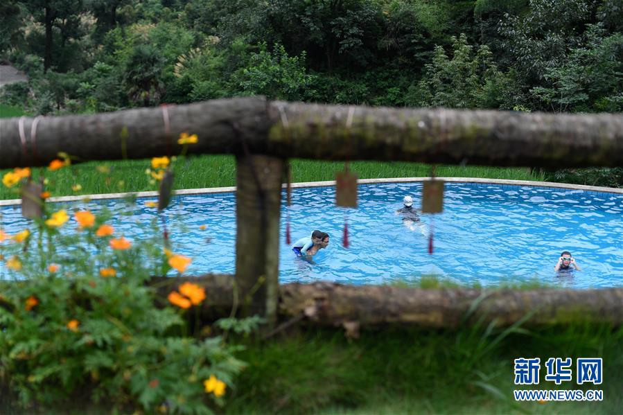 7月18日,游客在戴家山村一家民宿游泳。新丰民族村戴家山自然村是位于浙江省桐庐县莪山畲族乡海拔600米高山上的一个小山村。曾经由于交通不便,村民逐渐移居山下,村庄逐步“空心化”。近年来,戴家山村对30余幢老房子进行统一登记、收储、修缮、流转和招商,盘活闲置资源,发展高端民宿,村民按年收取租金,同时实现居家就业,既做“房东”,又做“股东”。2019年,戴家山村接待游客超过10万人,村民人均可支配收入超过2万元。新华社记者黄宗治摄