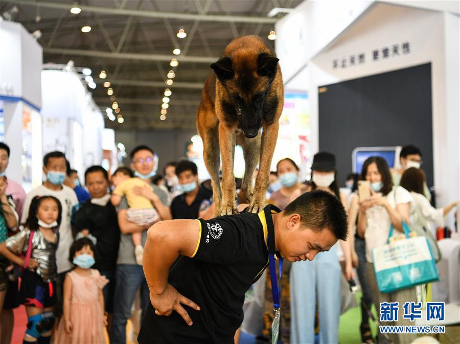 7月19日,在成都世纪城新国际会展中心,一家宠物学校的驯导师在表演驯犬。当日,第九届成都国际宠博会进入最后一天。此次展会展出面积30000平方米,汇聚国内外品牌企业和产品,覆盖中西部地区宠物行业食品、用品、医疗和服务等领域。新华社记者王曦摄
