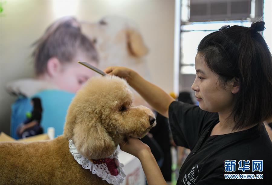 7月19日,在成都世纪城新国际会展中心,一家宠物美容学校的工作人员演示给宠物犬梳毛。当日,第九届成都国际宠博会进入最后一天。此次展会展出面积30000平方米,汇聚国内外品牌企业和产品,覆盖中西部地区宠物行业食品、用品、医疗和服务等领域。新华社记者王曦摄