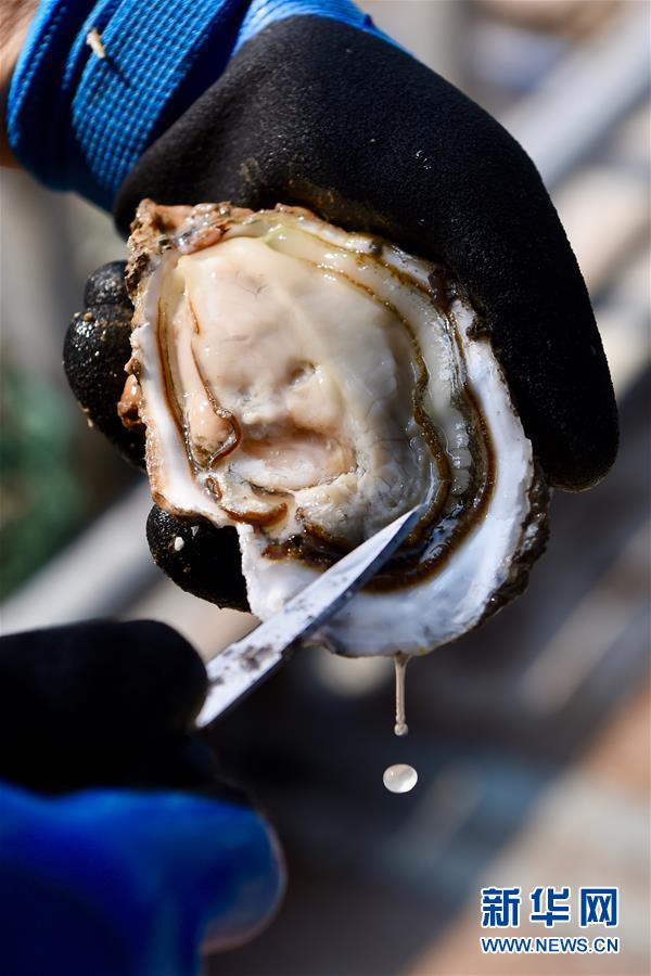 7月16日,福建省霞浦县长春镇秋竹岗村养殖大户俞开明展示一粒成熟的三倍体生蚝。新华社记者姜克红摄