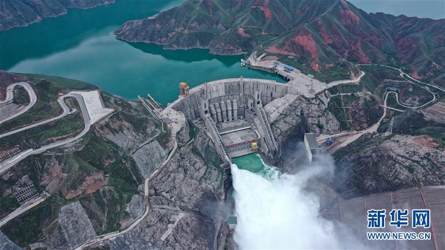 7月9日,位于青海省尖扎县和化隆县交界处的李家峡水电站提门泄水(无人机照片)。新华社记者吴刚摄