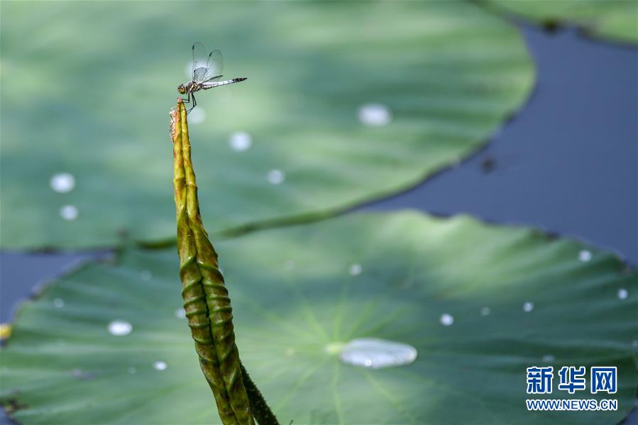 在吉林长春南湖公园,一只蜻蜓在荷叶上停歇(7月16日摄)。新华社记者张楠摄