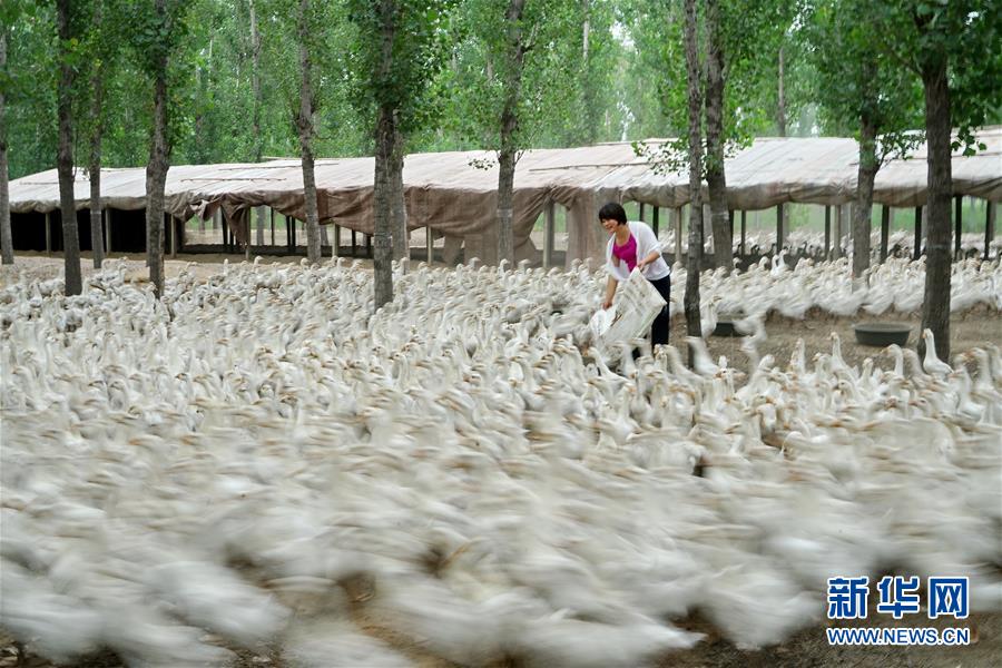 7月15日,河北省滦州市小马庄镇佘庄村村民在给鹅群投喂饲料。近年来,河北省滦州市小马庄镇充分利用林地资源,大力发展“林下经济”,引导农民发展畜禽、食用菌等产业,实现农林资源的优势互补。目前,小马庄镇已发展林下经济1000余亩,带动500余名村民实现增收。新华社记者牟宇摄