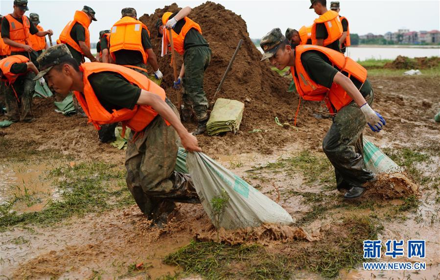 7月11日,武警战士在江西省鄱阳县鄱阳镇江家岭村搬运沙袋。新华社记者周密摄