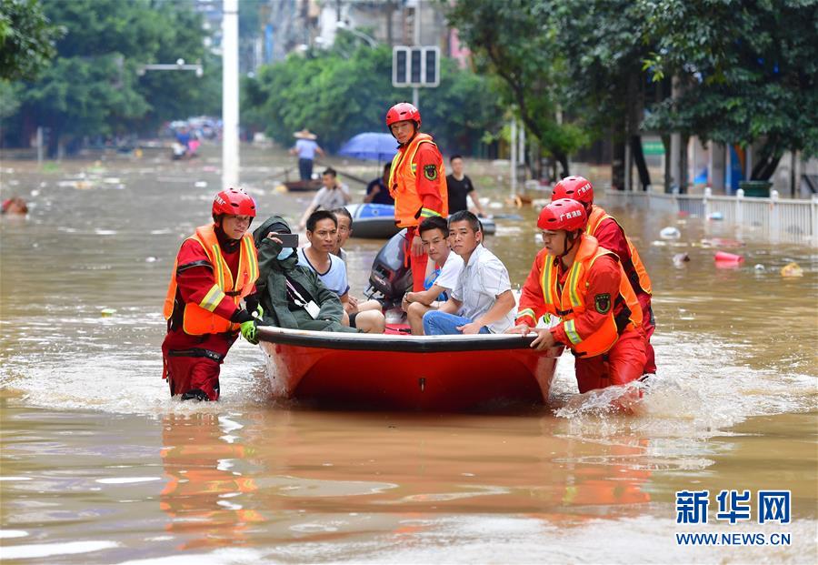 7月11日,广西融水消防救援大队的救援人员在转移被困群众。受连日强降雨影响,广西柳州市融水苗族自治县融江水位暴涨,导致县城出现严重洪涝灾害。新华社记者黄孝邦摄