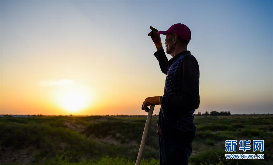 7月7日,孟和巴依尔站在改造后的荒滩上,远望腾格里沙漠。1993年,孟和巴依尔看到家乡内蒙古阿拉善盟阿拉善左旗超格图呼热苏木由于过度放牧,草场严重退化,于是,他与家人在家乡承包了4000多亩草场进行治沙造林。27年过去,孟和巴依尔一家承包的草场已从曾经生态脆弱的沙化土地变成了如今的茵茵绿洲。新华社记者连振摄