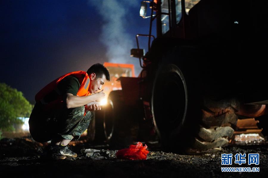 李群群在车辆旁边的泥地上吃晚饭(7月10日摄)。来自山东的李群群是中国安能第二工程局南昌公司的一名装载机操作手,之所以称同事为“战友”,是因为他所在的中国安能建设集团转制前是每逢抢险救援都冲在一线的武警水电部队。江西省鄱阳县问桂道圩堤决口后,李群群和大部队紧急赶到封堵现场开始作业。新华社记者周密摄
