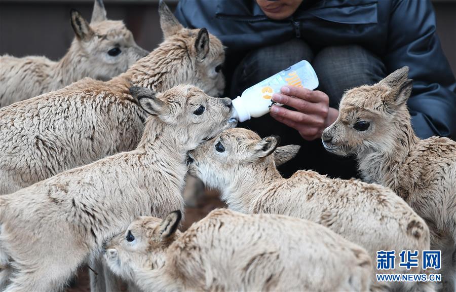 7月7日,三江源国家公园管理局长江源园区可可西里管理处卓乃湖保护站的工作人员才文多杰在给藏羚羊幼仔喂奶。新华社记者薛玉斌摄