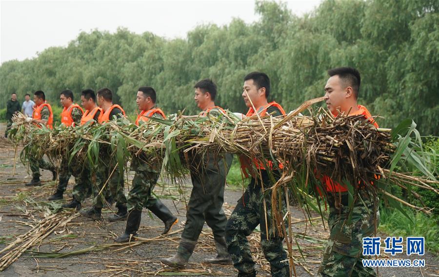 在镇江市丹徒区世业镇先锋村西南大堤,中国安能集团第二工程局常州分公司防汛前置备勤队员准备将捆好的芦苇放在江堤边(7月17日摄)。捆芦苇护边坡、机器人进涵洞、“养水盆”防渗漏……在江苏镇江,当地干部群众和专业力量,因地制宜就地取材,老办法搭配新技术,一批险情得以消除在萌芽状态。新华社记者季春鹏摄