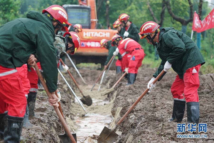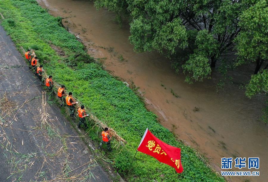 在扬中市长江大堤新坝镇新宁村段,中国安能集团第二工程局常州分公司防汛前置备勤队员在填充反滤料(7月17日摄)。捆芦苇护边坡、机器人进涵洞、“养水盆”防渗漏……在江苏镇江,当地干部群众和专业力量,因地制宜就地取材,老办法搭配新技术,一批险情得以消除在萌芽状态。新华社记者季春鹏摄