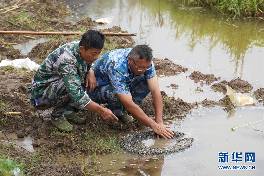 刘良武(右)与巡查人员在堤坝内侧处理一处泡泉(7月19日摄)。新华社记者张浩波摄