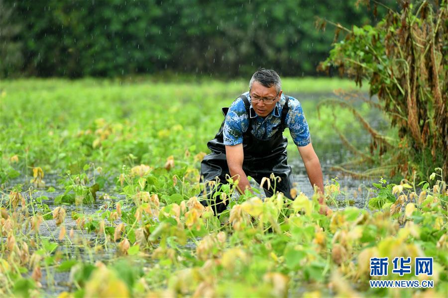 刘良武在堤坝内侧积水处排查泡泉(7月19日摄)。新华社记者周密摄