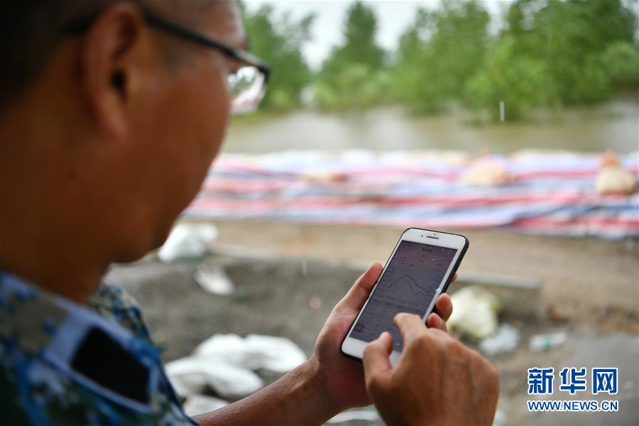 刘良武在手机上查询水位情况(7月19日摄)。新华社记者李鑫摄