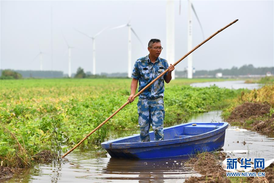 刘良武在堤坝内侧积水处排查泡泉(7月19日摄)。新华社记者李鑫摄