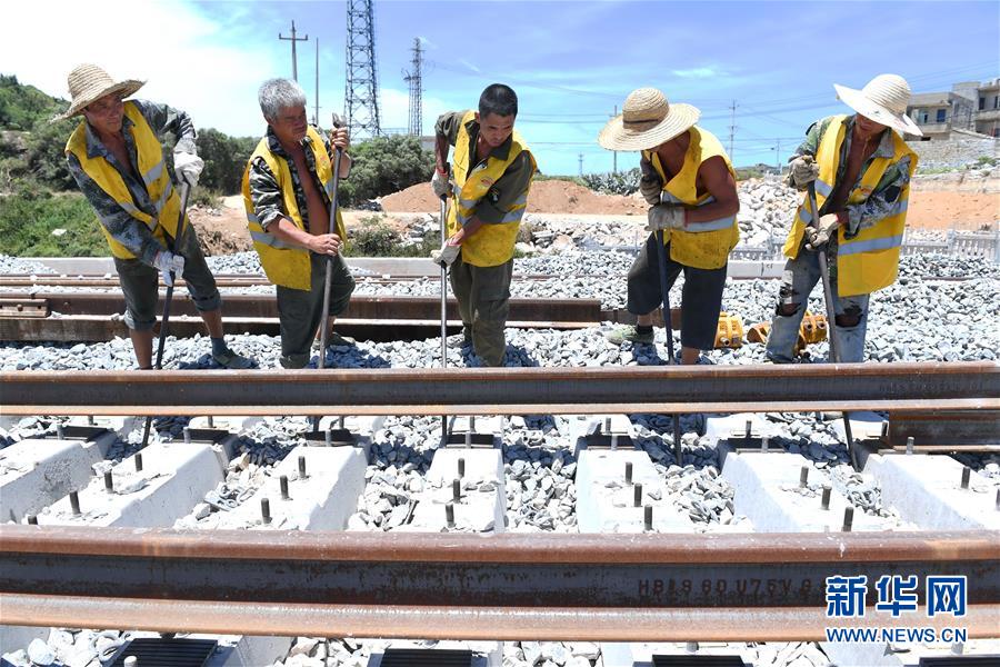 7月20日,中铁二十四局施工人员进行平潭海峡公铁大桥最后一根500米长轨的换铺工作。当日,中铁二十四局施工人员在平潭海峡公铁大桥进行最后一根铁路长轨换铺。至此,平潭海峡公铁大桥双线铁路长轨全部换铺完成。新华社记者林善传摄