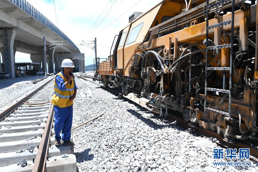 7月20日,中铁二十四局施工人员在平潭海峡公铁大桥施工现场作业。当日,中铁二十四局施工人员在平潭海峡公铁大桥进行最后一根铁路长轨换铺。至此,平潭海峡公铁大桥双线铁路长轨全部换铺完成。新华社记者林善传摄
