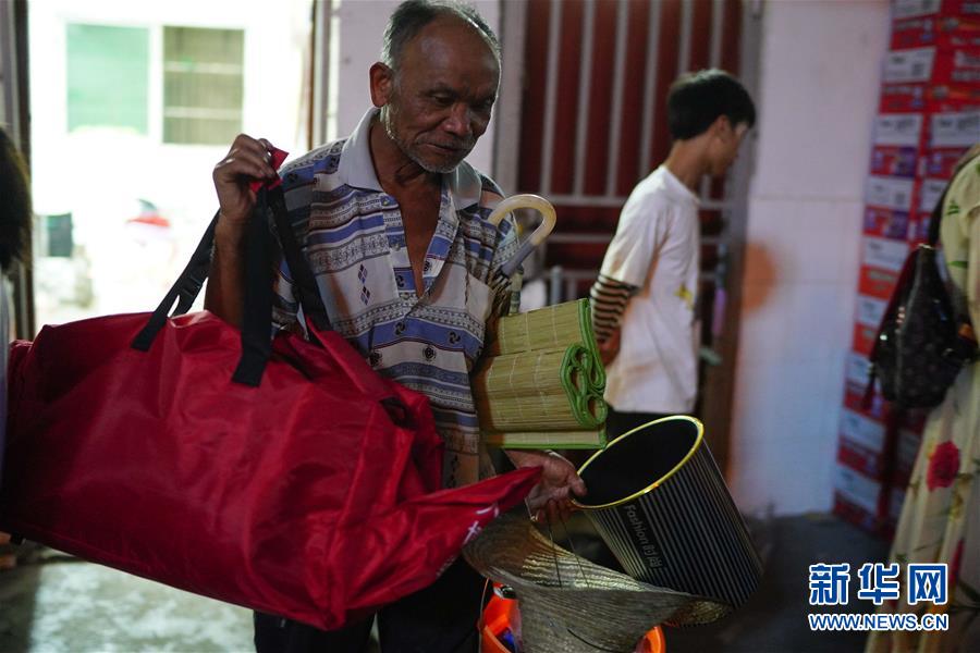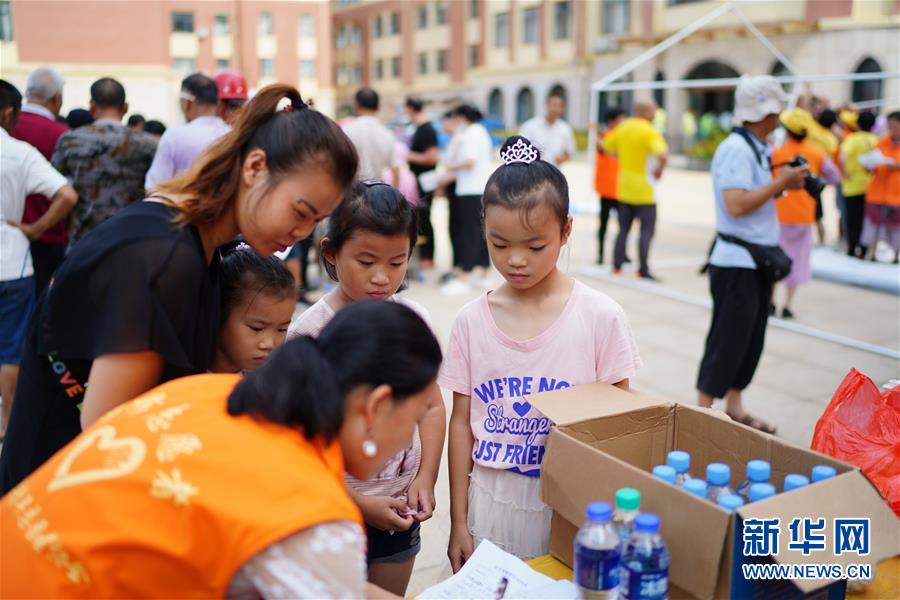 村民在江西鄱阳县五一中心学校安置点领取物资(7月9日摄)。新华社记者周密摄
