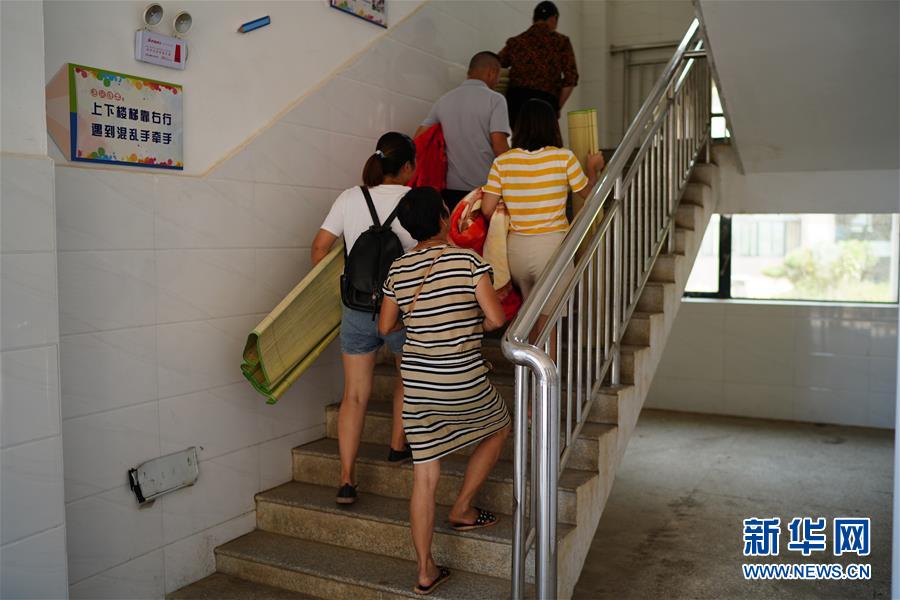 在江西永修县湖东学校安置点,群众携带行李前往安置住处(7月13日摄)。新华社记者周密摄
