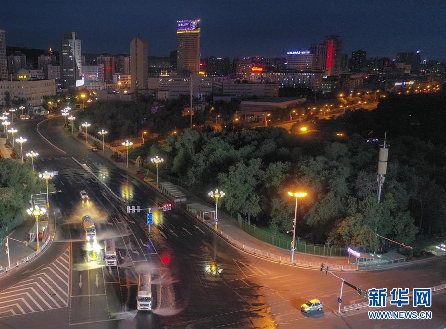 7月20日,乌鲁木齐市天山区城管局清运队的工作车辆在市区西大桥进行消杀作业(无人机照片)。乌鲁木齐市天山区城管局自7月17日起,对天山区的主次干道76条及235条巷道进行集中消杀。目前,乌鲁木齐市对重点区域进行全面消毒消杀。新华社记者赵戈摄