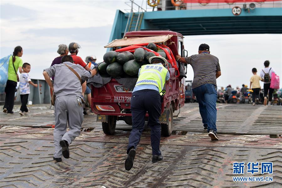 在江西省九江市柴桑区江新洲的渡口,部分居民登上渡轮撤离(7月12日摄)。新华社记者彭昭之摄
