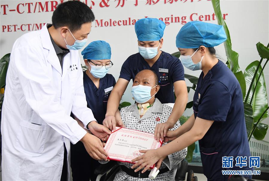 7月21日,国家卫健委医政医管局医疗质量与评价处副处长马旭东(左一)为崔先生颁发了编号为“5510”的“战胜者证书”。新华社记者程敏摄