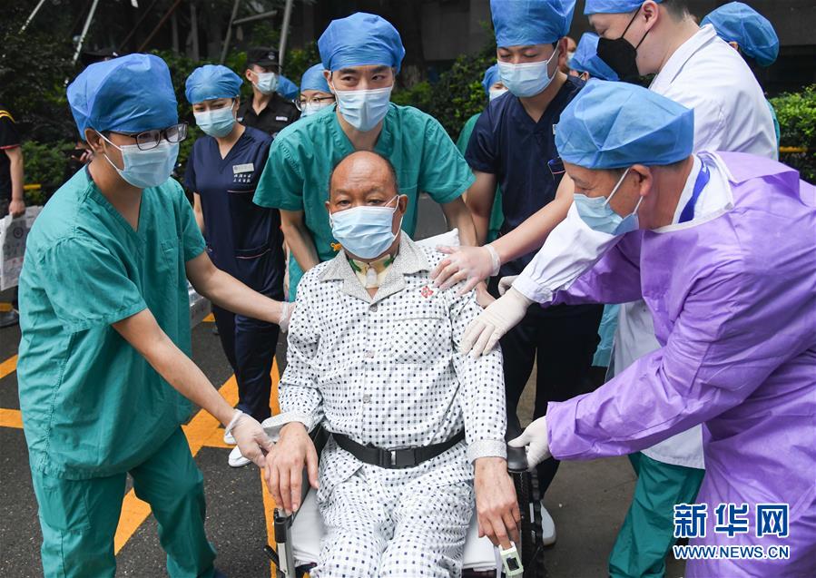 7月21日,武汉大学人民医院医护人员护送崔先生出院。新华社记者程敏摄