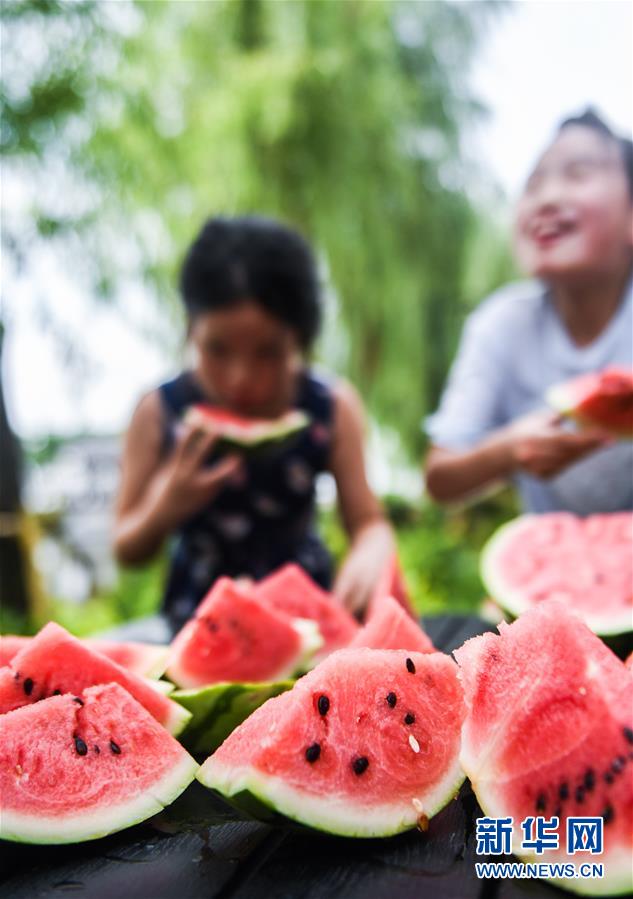 7月22日,庙兜村的孩子们在比赛吃西瓜。当日是大暑节气,浙江省湖州市吴兴区织里镇庙兜村举行了趣味“赛西瓜”比赛,迎接这个“火热”的节气。庙兜村种植有500多亩西瓜,目前正值西瓜丰收的时节,村民们用“赛西瓜”的形式,感受丰收的喜悦。新华社记者徐昱摄