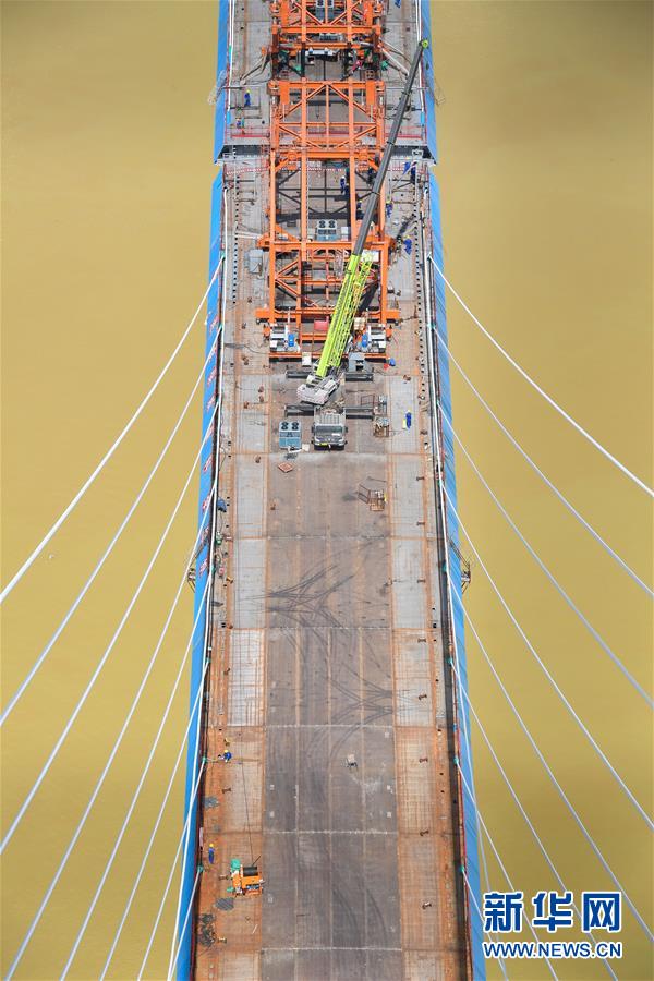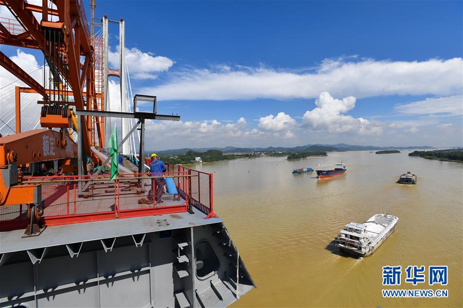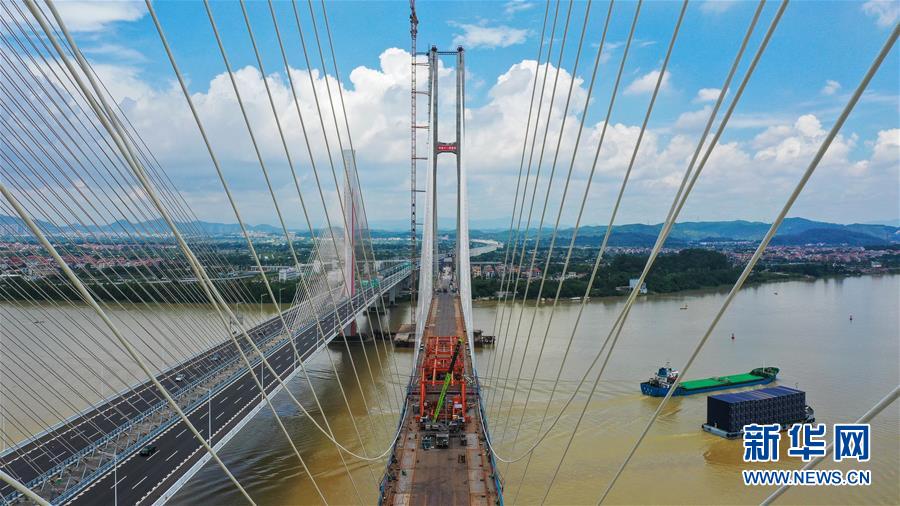 7月22日,广州南沙港铁路跨西江特大斜拉桥在进行最后一组斜拉索吊装。新华社记者刘大伟摄