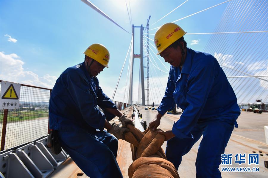7月22日,施工人员在广州南沙港铁路跨西江特大斜拉桥进行最后一组斜拉索吊装作业。新华社记者刘大伟摄