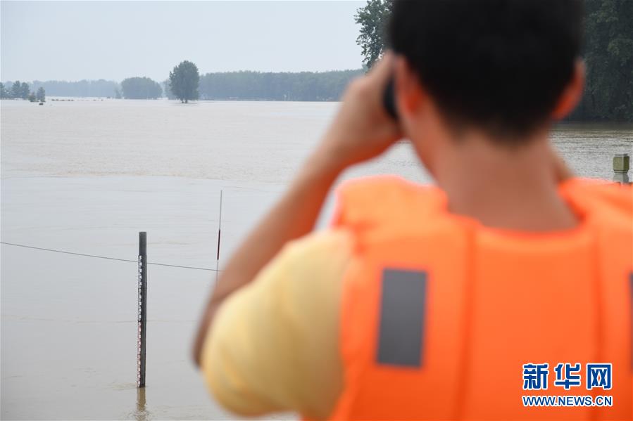 7月22日,安徽省阜南县王家坝水文站的工作人员在查看水位。7月22日14时,淮河王家坝水位降至28.73米,超警戒水位1.23米,低于保证水位0.57米。新华社记者张端摄