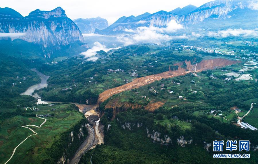 7月22日拍摄的因恩施州屯堡乡马者村山体滑坡形成的堰塞湖(无人机照片)。新华社记者肖艺九摄