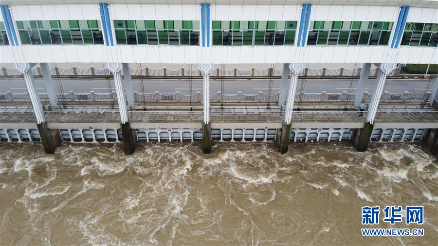 这是7月23日在安徽省阜南县拍摄的正在关闸的淮河王家坝闸(无人机照片)。当日13时,淮河干流王家坝闸关闸,停止向蒙洼蓄洪区泄洪。新华社记者张端摄