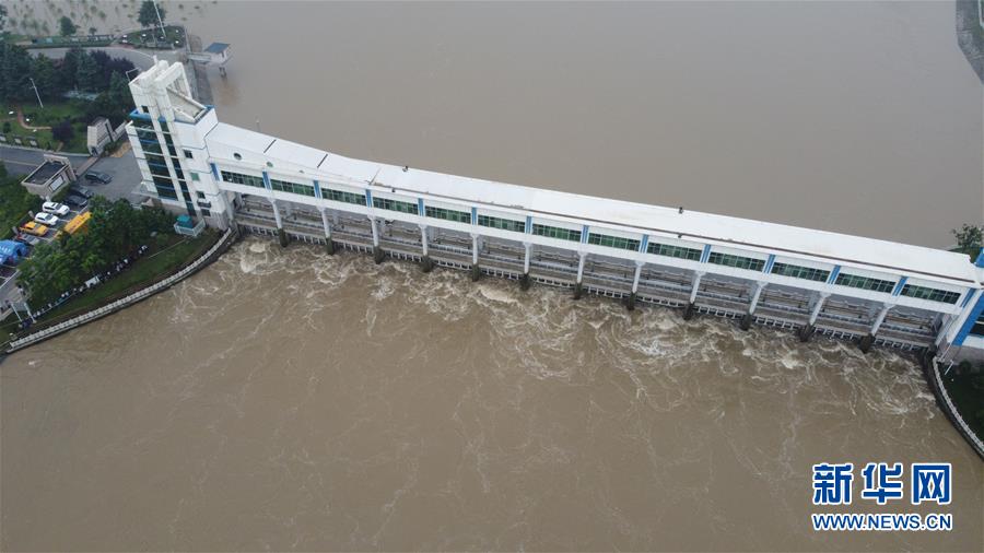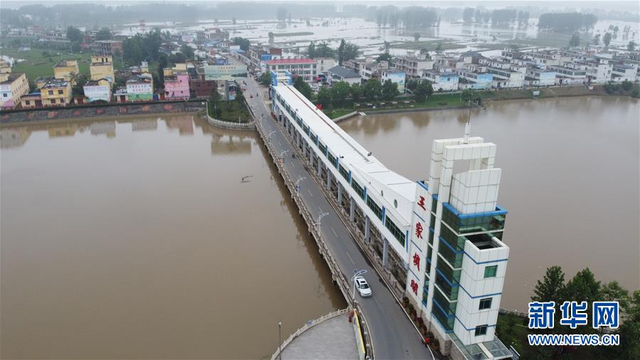 这是7月23日在安徽省阜南县拍摄的正在关闸的淮河王家坝闸(无人机照片)。当日13时,淮河干流王家坝闸关闸,停止向蒙洼蓄洪区泄洪。新华社记者张端摄