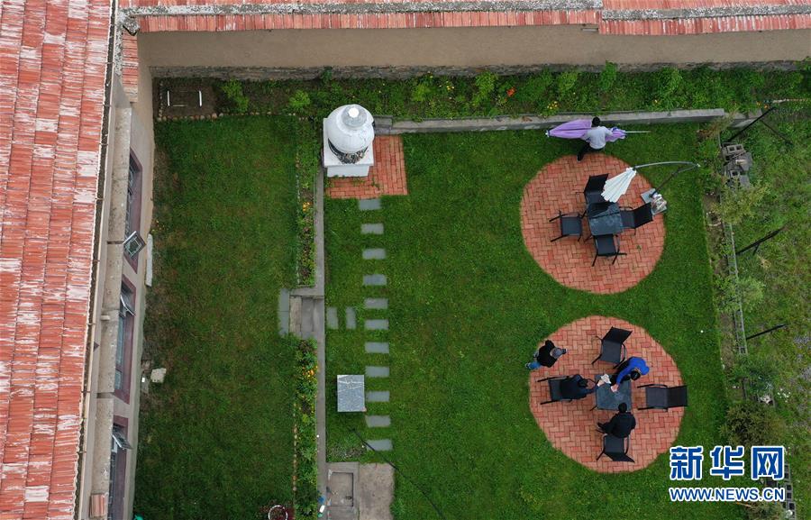 7月5日拍摄的阿坝县查理乡神座村客栈院落(无人机照片)。新华社记者陈天湖摄