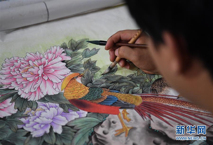 7月22日,王红彬在家中创作工笔画。新华社记者朱旭东摄