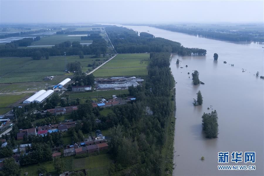 淮河边的盱眙县鲍集镇新迁村(7月23日摄,无人机照片)。7月23日,受淮河盱眙段水位上涨影响,江苏省淮安市盱眙县启动鲍集圩行洪区万余名群众撤离转移工作,确保安全度汛。新华社记者韩瑜庆摄