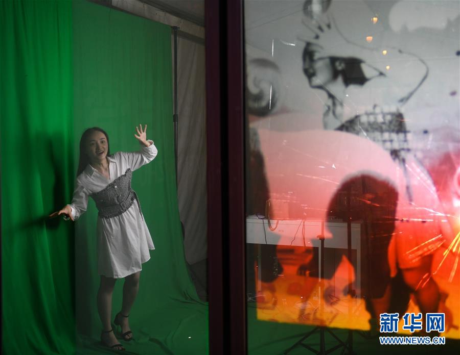 7月23日晚,在成都市成华区望平街滨河路的天府文创大集市上,游客在体验虚拟数字投影设备。新华社记者 王曦 摄