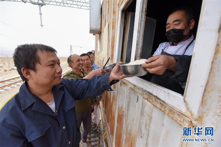 在索尔库里宿营地,中铁一局的施工人员排队打饭(7月19日摄)。新华社记者 丁磊 摄